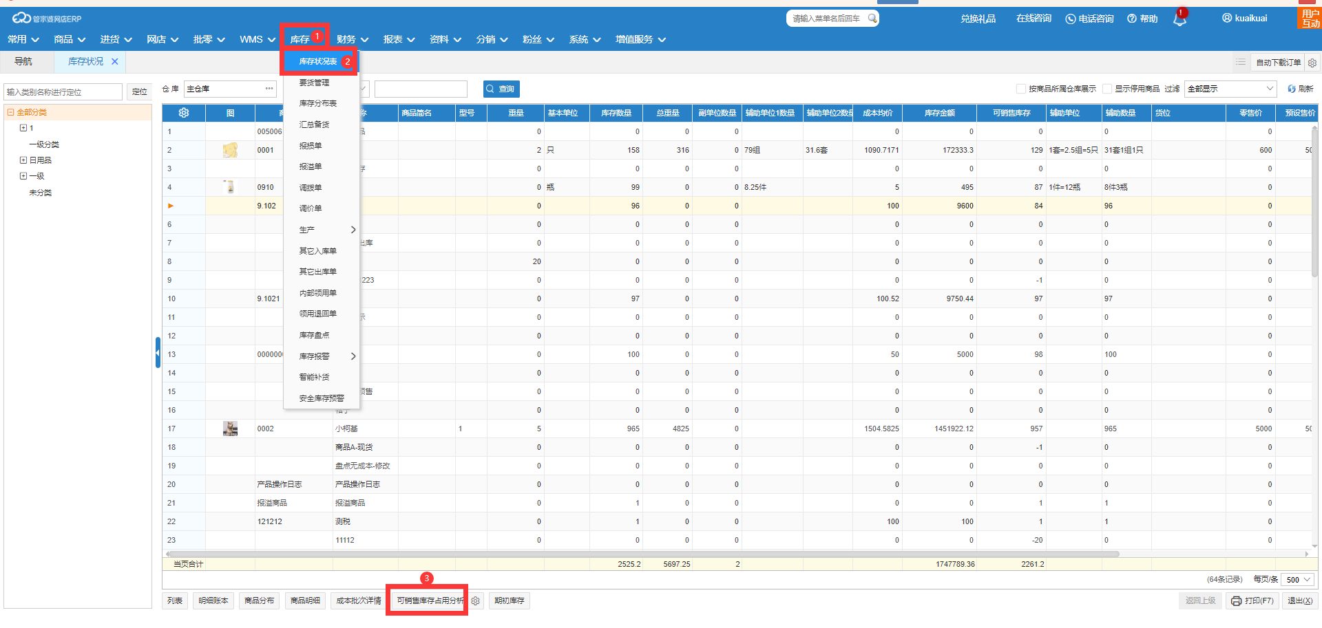 首先:【库存】-【库存状况表】中,选中需要查询的商品后,点击页面下方【可销售库存占用分析】,查看是哪些单据占了可销售库存;