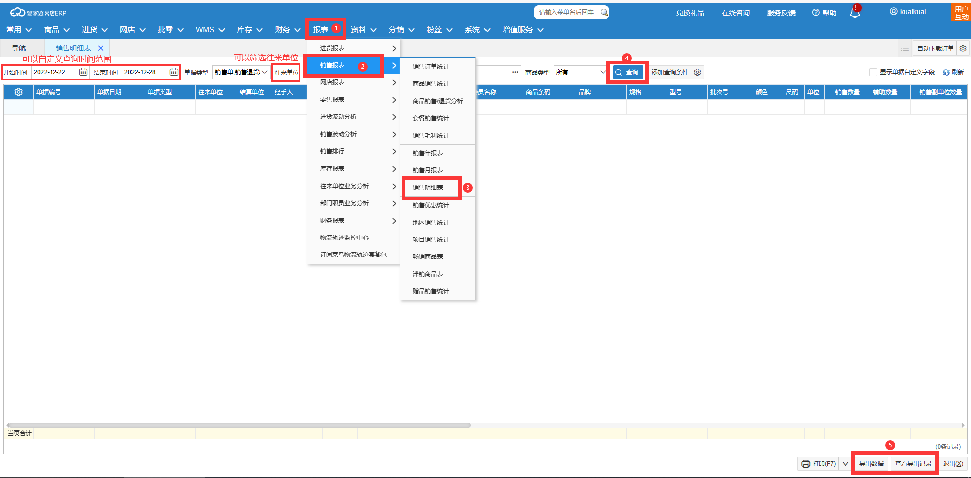首先,在【报表】—【销售报表】—【销售明细表】界面,筛选所需要的查询条件,如:往来单位名称、时间、仓库、商品等等条件,进行查询所需要条件的销售明细数据,